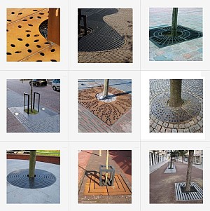 een aantal boomroosters, hedendaags en traditioneel, als mogelijkheid om de boomspiegel te bedekken; klik voor groter! (doelbeelden): ![]() |