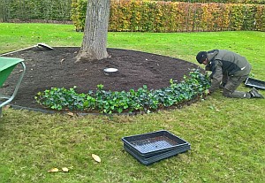 boomspiegel als omgewoelde aarde rond een solitaire boom in een park; hier gedeeltelijk bedekt met klimop (de boomdokter): ![]() |