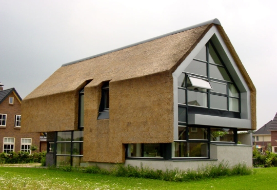 | hedendaags, kubistisch architectonisch rietdak met rechte breeuwen (van den bergh rietdekkers):  |