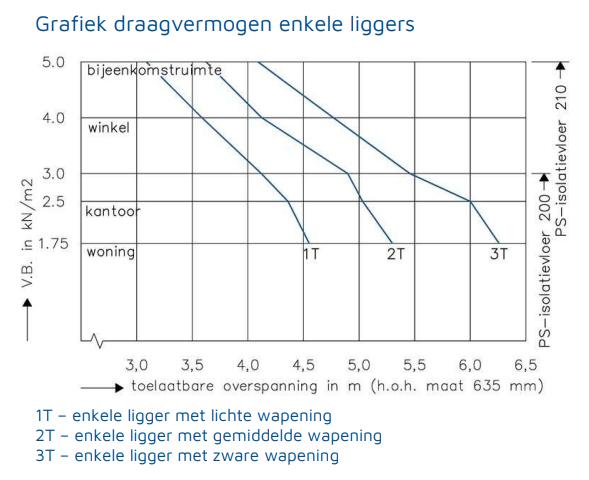 broodjesvloer met polystyreen, belasting (draagvermogen) en toelaatbare overspanning bij belasting van 175-500 kg/m2 (1,75-5,0 kN/m2) met lichte, gemiddelde of zware wapening van de liggers; klik voor groter (vbi): ![]() |