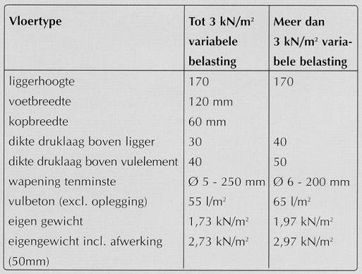 broodjes van polystyreen broodjesvloer met polystyreen, druklaag , wapening, werkende breedte, hoogte balk+druklaag (vbi): |