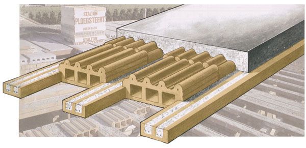 - broodjes van gebakken klei (Stalton-vloer en Staltonpaneel; "staltonpanelen zijn geprefabriceerde vloersystemen bestaande uit naast elkaar geplaatste, voorgespannen, zelfdragende betongewelven").