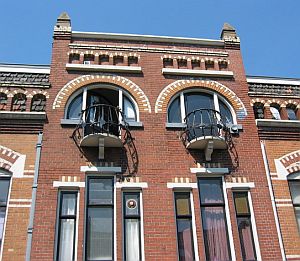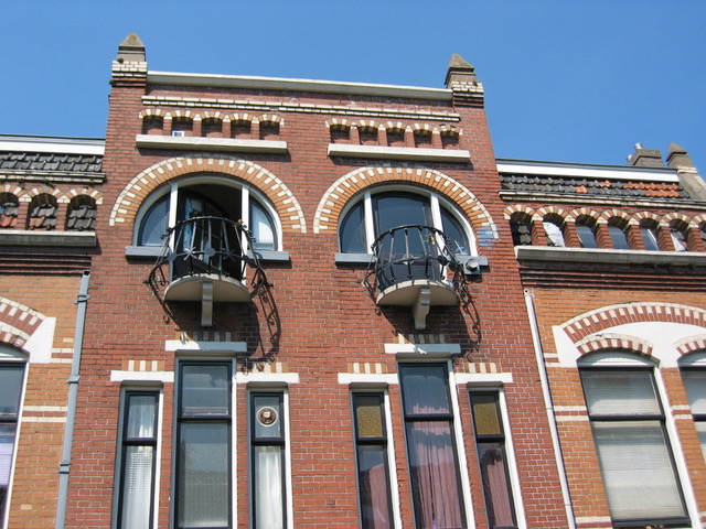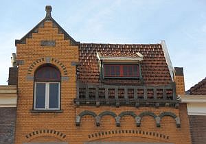 niet altijd zijn de dakbalustrades opengewerkt, soms zijn ze dichtgemetseld; de reden daarvan is niet duidelijk; jugendstil pand, eigenhaardstraat 9, zwolle, 1894 (copyright arno weltens): ![]() |
