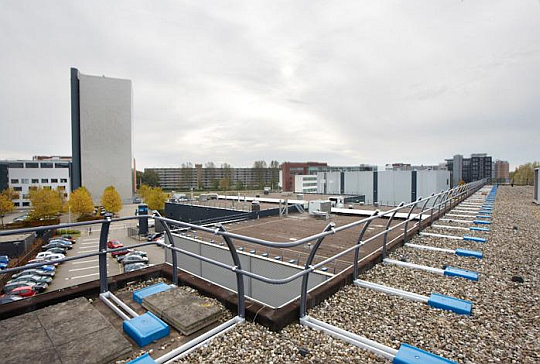een dakbalustrade, hier een niet onaardige, permanente valbeveiliging bij een plat dak door een hekwerk, ook inklapbaar te verkrijgen (allrisk): ![]() |