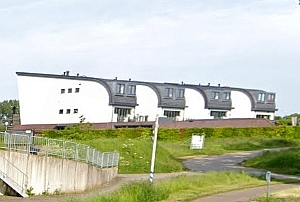 schijn-scheluw; dit dak lijkt scheluw maar nok en dakvoet liggen in hetzelfde vlak; nok en dakvoet zijn alleen niet evenwijdig aan elkaar; de zwarte horizontale lijn bij de dakvoet is in de foto ingetekend (foto joostdevree): ![]() |