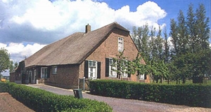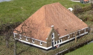 ![]() "In de negentiende eeuw overstroomde het Zuidhollandse rivierengebied herhaaldelijk. Het gevolg was dat de boeren zich tegen dit gevaar gingen wapenen. Er werd bijvoorbeeld een waterzolder in de boerderij gemaakt, waarop hooi en vee droog bleven. Het bedrijfsgedeelte kreeg daardoor een hoger dak. In de Alblasserwaard werd het niveauverschil tussen de daken van het woonhuis en het bedrijfsgedeelte vaak vloeiend overbrugd, waardoor er een opwelvend dak ontstond. Dat wordt 'kameeldak' genoemd." Foto en tekst van Landleven (discl.). |