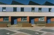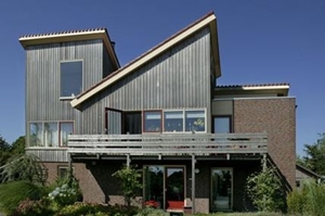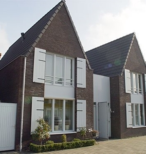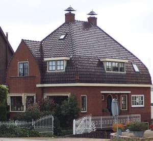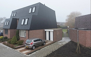 Knikdak (gebroken dak) met verticale "dakpan"gevel, een kapvorm die steeds vaker voorkomt, hier met een bolle en een holle knik (resp. achterzijde en voorzijde woning).![]() |