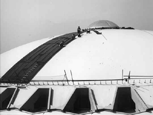 een bijzondere vorm van een tentdak, een soort kloostergewelf, Maple Leaf Gardens, Toronto: ![]() |