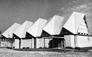 "Vouwdak", prefab stressed skin panelen van multilpex met ertussen een houten raamwerk van 5x10 cm, Trinity Lutheran Church of Lake Johanna, St. Paul Minnesota, architect Buetow & Associates: ![]() |