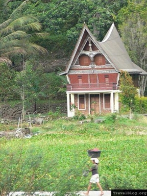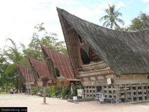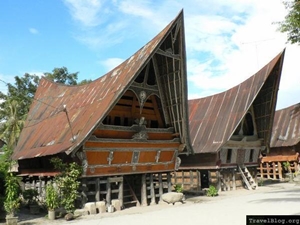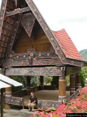 | Een soort zadeldak van de Batak-stam op een eiland in het midden van het Tobameer (Samosir op Sumatra, Indonesië). Dit traditionele huis wordt op Sulawesi (het vroegere Celebes) "tongkonan" of "rumah adat" genoemd. Op Sulawesi (Indonesië) worden deze met geometrische patronen versierde daken "toraja" genoemd, in het Nederlands "toradja". Verg. pagode. |