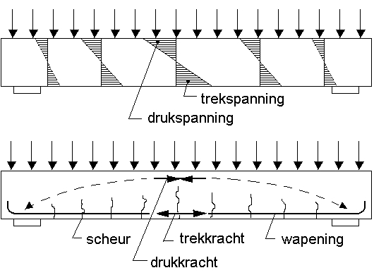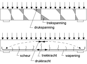 gewapend beton met mogelijke scheurvorming en daarmee het nut van wapening; drukspanning, trekspanning, drukkracht, trekkracht (civiele techniek tu delft): ![]() |