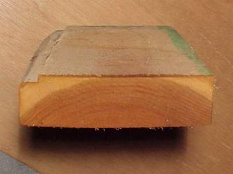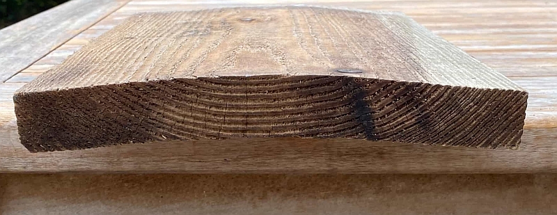 Kromtrekken van hout, let op de jaarringen en de richting van het kromtrekken (Moose Färg houtverven)