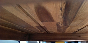 Een (gedeeltelijke) inkeping aan de onderzijde van bijvoorbeeld een tafelblad van aan elkaar gelijmde latten kan het werken van het hout (scheuren, kromtrekken) tegengaan (klik op foto voor groter; foto joostdevree):