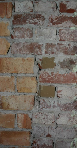 inboeten: transversaalscheur (scheur die loodrecht de muur in gaat) met al uitgehakte vertanding om nieuwe stenen goed in te kunnen boeten; transversaalscheuren kunnen ook horizontaal lopen; wellicht om die reden of om het geheel constructief te versterken is ook een deel horizontaal weggehakt maar ook ook hier is sprake van vertanding (stichting erm): ![]() |