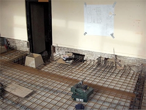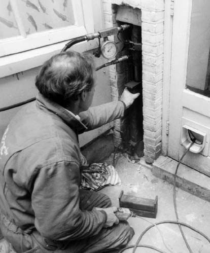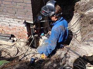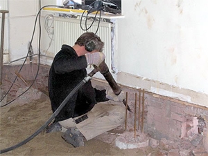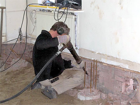 De foto onder toont een inkassing in de muur om een heimachientje voor een Sobu-paal ruimte te geven; deze methode van funderingsherstel wordt toegepast bij funderingen op staal die niet meer voldoende draagkracht hebben en soms bij fundering op palen.