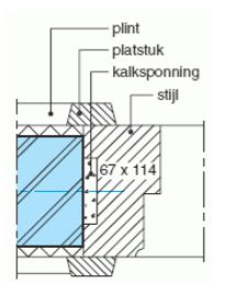 "In de kozijnstijlen freest men over de gehele stijllengte een kalksponning, ook wel kloostersponning genoemd. Het doel van deze kalksponning is een doorgaande naad te voorkomen en een goede verbinding tussen hout en steenachtig materiaal te verkrijgen. De afmeting van de kalksponning is 8 mm diep en ca. 65 mm breed, afhankelijk van de freesbeitels die de aannemer gebruikt. Tijdens het metselen van de binnenmuren vult men deze sponning met metselmortel."