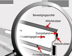 "De loodknelstrip van gerecycled slagvast hard pvc is voorzien van rubber, een waterdichte band en afwateringsgaten, waardoor hier de kitspuit overbodig is geworden."