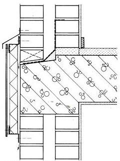 isoleren van de koudebrug bij een doorlopende verdiepingvloer (betonvloer door gevel; met dank aan bouwkundig detailleren van aad van berkel en het nationaal isolatie programma 1987); let op: (a) de waterlijst om water van de gevel af te voeren (b) de open stootvoeg en de geringe spouw tussen gevel en nieuw isolatiemateriaal om water uit de spouw af te voeren): ![]() |