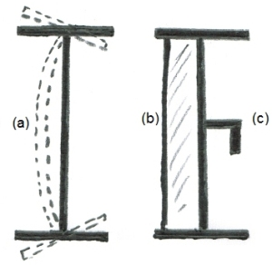 onderstaand het nut van verstijving van een H- of I-profiel tot een verstijvingsligger; verstijving van de ligger heeft tot doel de ligger en daarmee de constructie waarvan de ligger een onderdeel is, meer stijfheid te geven; tekening van een mogelijke buiging van een ligger (hier een i-profiel) en de mogelijkheden tot verticale en horizontale verstijving; - bij (a) een mogelijke verbuiging onder invloed van een belasting - bij (b) een verticale verstijving (een plaat staal tussen bovenflens en onderflens, loodrecht op het lijf van de ligger) - bij (c) een horizontale verstijving (een L-vormige plaat staal gelast op het lijf van de ligger) ![]() |