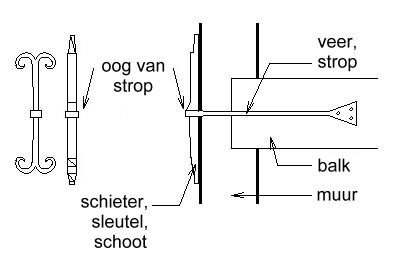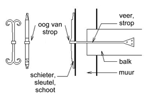 | tekening met verschillende muurankers; balk, muur, veer (ankerveer, strop), oog van strop en schieter (sleutel, schoot) (liesbeth van lint, museum het mot, aangepast): |