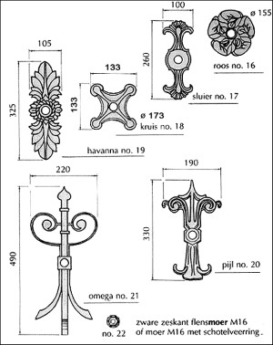 verschillende muurankers, waarbij voor het gietijzeren rozet e.d. ook wel ankers (veren) met een schroefdraad werden toegepast zodat de rozet e.d. op de veer geschroefd kon worden: ![]() |