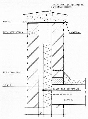 muurdeksel, constructief, met vastzetten (verankering muurdeksel; sparingen dichten), waterhol, en in muur bij muurdeksel kitvoeg, open stootvoeg, rvs verankering, bevestiging ankerstaaf, isolatie; onder het balkon of dakterras bevindt zich hier waarschijnlijk een appartement (knb keramiek, aangepast): ![]() |