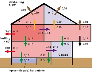 voorbeeld met o.m. hellend dak, dakterras, onverwarmde ruimte op zolder, onverwarmde garage; gevel is te zien als een helling van > 60 graden (klimapedia):![]() |