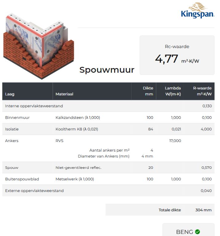 voorbeeld berekening rc-waarde van een spouwmuur, geschikt voor bijna-energieneutraal beng; klik voor groter! (kingspan rc-calculator): ![]() |