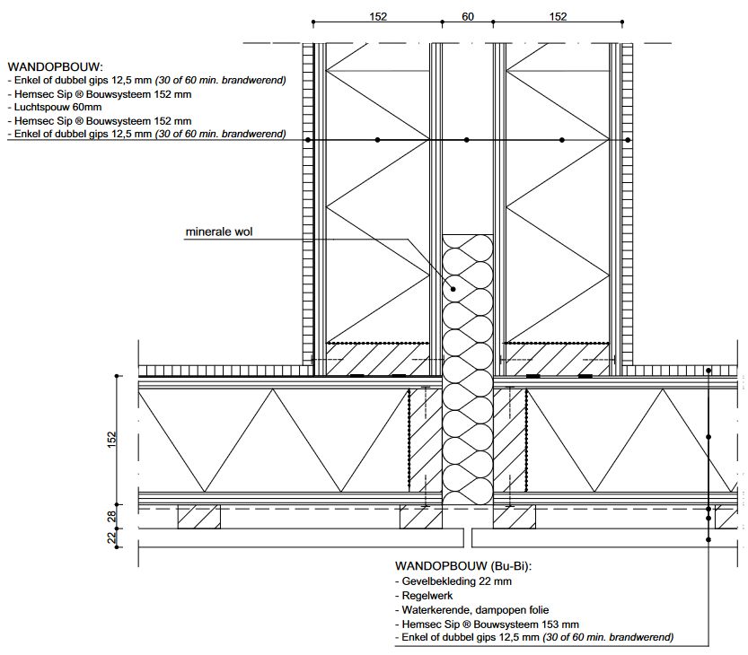 - aan de binnenzijde worden afgewerkt met een gipsplaat of gipsvezelplaat (ook voor de brandwerendheid; twee lagen gipsplaat geeft 60 minuten brandvertraging)