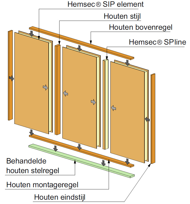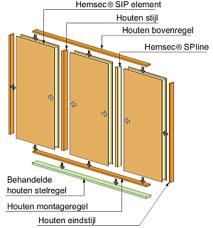 hemsec-sips; bouwschema sip's met stelregel, montageregel, sip-elementen, houten stijlen en tussen-sip-elementen; klik voor groter (hemsec sips supply): ![]() |