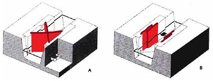 Kruisende deuren: twee paren puntdeuren, in gesloten stand en gezien van boven vormen zij een Grieks kruis (X), in geopende stand bevinden de deuren zich in deurkassen aan weerszijden van de sluisdoorgang, kunnen naar twee zijden water keren.