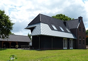 "spiegel" bij een dak van pannen en metaal, boerderijwoning hurwenen met dakvlakken die goed in een landelijke omgeving passen; klik voor groter (joustrareid architecten): ![]() |