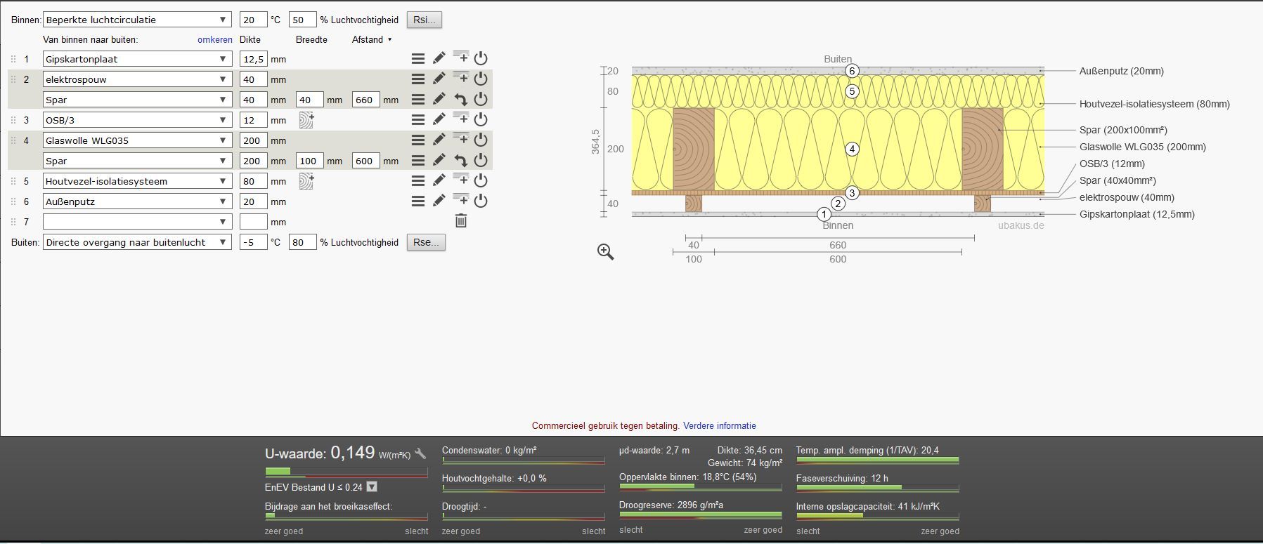 van een isolatiepakket van 137 mm (warmtegeleidingscoëfficiënt = 0,030 W/m.K) en 2