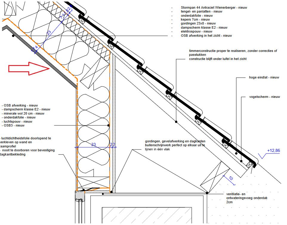 tussen het isolatiemateriaal in het dak en de  dakbedekking (bijvoorbeeld dakpannen)