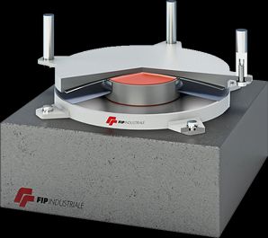 een slider (demper), als onderdeel van base isolation, bestaat uit twee horizontale elementen (schalen) die ten opzichte van elkaar kunnen bewegen (één element op de fundering en één aan onderzijde van de vloer) en met een glijplaat van hoogwaardig kunststof; "ter plaatse van de bouwmuur zijn de vloerplaten van de twee woningen gekoppeld tot één schijf doordat ze op dezelfde slider liggen"; de weerstand in de schalen is in verschillende sterkten verkrijgbaar, af te stemmen op de belasting en de kracht van de aardbeving (op de foto de fip-d-isolator, vilton): ![]() |