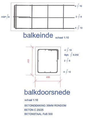 (bijvoorbeeld 35 mm rondom), balkeinde met de wapening, het soort beton (sterkteklasse