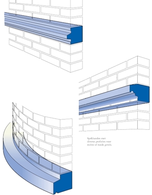 Zie bijvoorbeeld inspringend en uitspringend, afdekband, afdeklijst, astragaal, cordon(lijst), eierlijst, Grieks motief, knelstrip, lintvoeg, liseen, muizentand, plint, profiel, riem, rollaag, tandlijst, zwelstrip, taenia.