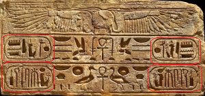 | de namen van ramses iii in hiërogluefen geschreven, zowel van links naar rechts (linkerdeel van de afbeelding) als van rechts naar links (rechterdeel) (british museum):  |