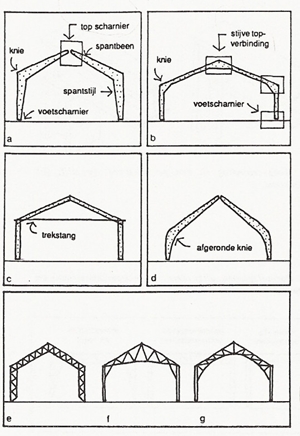 | klik op de afbeeldingen voor groter voorbeelden kniespanten in vollewand (met topscharnier, stijve topverbinding, trekstang), afgeronde knie en in vakwerk:  |