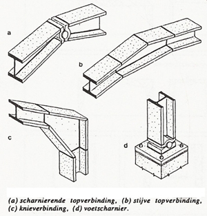 | principedetails van verbindingen in kniespanten met (a) scharnierende topverbinding (b) stijve topverbinding (c) stijve knieverbinding in spantbeen (altijd) (d) voetscharnier:  |