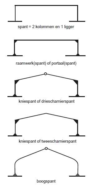 | portaalachtige spanten: portaal (portaalspant), driescharnierspant, tweescharnierspant, boogspant (draagconstructies basis):  |