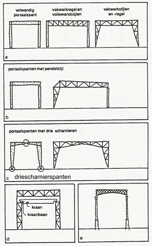 | soorten portaalpanten als (gedeeltelijke) vakwerkconstructie: volwandig portaalspant, vakwerkregel en vollewandstijlen, vakwerkstijlen en -regel, portaalspanten met pendelstijl, portaalspanten met drie scharnieren, kraanbaan; klik voor groter:  |