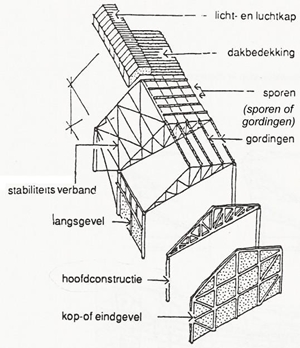 | secundaire constructies van een hal,lichtkap, luchtkap, sporen of gordingen, stabiliteitsverband, langsgevel, lkopgevel (eindgevel); klik voor groter:  |