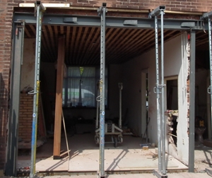 | stalen portaalspant toegepast bij de aanbouw van een woning; klik voor groter (deels zichtbaar; bnla architecten):  |