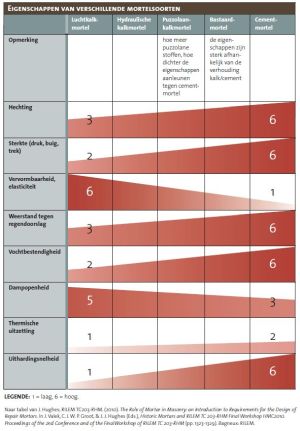 eigenschappen van verschillende mortelsoorten; luchtkalk mortel, hydraulische kalkmortel, puzzolaan kalkmortel, bastaardmortel, cementmortel; klik voor groter! (uit de brochure voegwerk van monumentenwacht vlaanderen): |