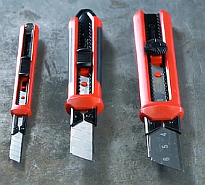 drie voorbeelden van afbreekmessen van hultafors (smal, medium, breed; "vin" achteraan mes; zonder en met wheel-lock):![]() |