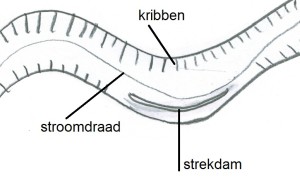 afkalven tegengaan door kribben en strekdam (de stroomdraad geeft de stroming aan): ![]() |
