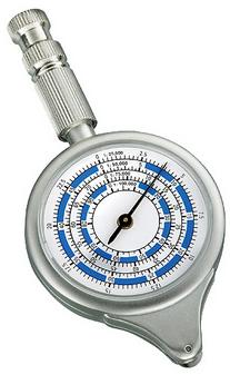 3. Een geheel ander soort afstandsmeter is de zogenoemde curvimeter, een apparaatje uit de pre-digitale tijd dat met de navigatiemiddelen en Google Maps niet vaak meer gebruikt wordt, maar toch heel handig kan zijn. De afstand van twee punten op een kaart kun je te weten komen door met het kleine wieltje de weg op de kaart te volgen. Bij de juiste schaalaanduiding geeft het wijzertje het aantal af te leggen of afgelegde kilometers aan (draai vóór gebruik het wijzertje weer op de nulstand). Het voordeel van de curvimeter is dat op de kaart de bochten in de weg goed gevolgd kunnen worden. Vaak zijn aan beide zijden van de curvimeter verschillende schaalverdelingen gemaakt.