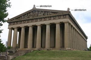 2. Het akroterion is in de klassieke Griekse en Romeinse bouwkunst het beeldhouwwerk dat op de sokkel op de top en op de hoekpunten van een fronton staat.