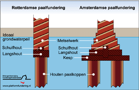 rotterdamse en amsterdamse methode en het ideale grondwaterpeil; klik voor groter (kennis centrum aanpak funderingsproblematiek kcaf): ![]() |